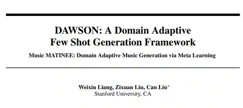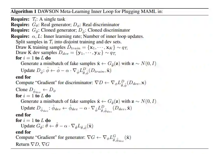为一个新领域从无到有地训练一个可生成对抗网络(GAN)需要大量的训练数据和几天的训练时间。为此,我们提出了一种基于元学习的GANs领域自适应少镜头生成框架DAWSON。在GANs上应用元学习的一个主要挑战是,由于GANs的无概率特性,通过在开发集上对生成器进行评估来获得生成器的梯度。为了解决这一挑战,我们提出了一个替代的GAN训练过程,它自然地结合了GANs的两步训练过程和元学习算法的两步训练过程。DAWSON是一个即插即用的框架,它支持一个广泛的元学习算法家族和各种具有体系结构变体的GANs。在DAWSON的基础上,我们还提出了音乐日场,这是第一个少镜头的音乐生成模型。我们的实验表明,音乐日场可以快速适应新的领域,只有几十首歌曲从目标领域。我们还表明,DAWSON可以学习生成新的数字只有四个样本在MNIST数据集。我们在PyTorch和Tensorflow中发布了DAWSON的源代码实现,生成了两种类型的音乐样本和快闪视频。
