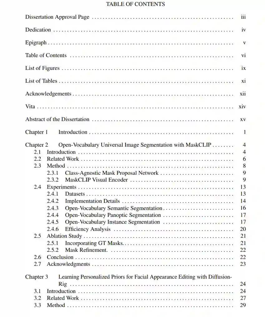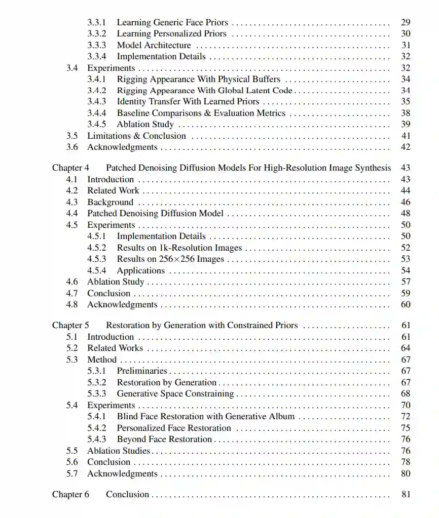 第二章引入了一个新颖的任务:开放词汇通用图像分割(open-vocabulary universal image segmentation),其目标是在推理阶段对任意描述类别执行语义分割、实例分割和全景分割。我们首先基于预训练的 CLIP 模型构建了一个基线系统,并提出了 MaskCLIP——一种基于 Transformer 的方法,采用 MaskCLIP 视觉编码器将掩码 token 融合进预训练的 ViT-CLIP 模型中。该设计在无需计算密集型的师生训练框架下,有效利用 CLIP 的密集特征,实现了分割和类别预测。 第三章介绍了用于个性化面部外观编辑的 DiffusionRig。该方法基于从真实环境图像中估计得到的粗略三维人脸模型,使用条件扩散模型将简单的 CGI 渲染映射为逼真的个人图像。DiffusionRig 采用两阶段训练策略:首先在大规模数据集上学习通用的面部先验,然后在少量个体图像上进行微调。该策略能稳健地编辑面部特征,同时保留个体身份与高频细节。 第四章介绍了 Patch-DM,一种去噪扩散模型,在训练过程中使用小图像块(如 64×64)生成高分辨率图像(如 1024×512)。该方法通过一种新颖的特征拼接策略,缓解了基于图像块合成中常见的边界伪影问题。具体地,该策略通过裁剪并组合邻近图像块中重叠的特征,实现了对偏移图像块的无缝预测。 第五章提出了一种将预训练去噪扩散模型适配至图像修复任务的方法。该方法通过向退化图像中添加噪声,然后利用预训练模型进行去噪,从而完成图像修复。通过在选定的锚图像上微调模型,以保持输入图像的特征,该受限生成空间确保了在保持原始身份与整体质量的同时,获得高质量的修复结果。