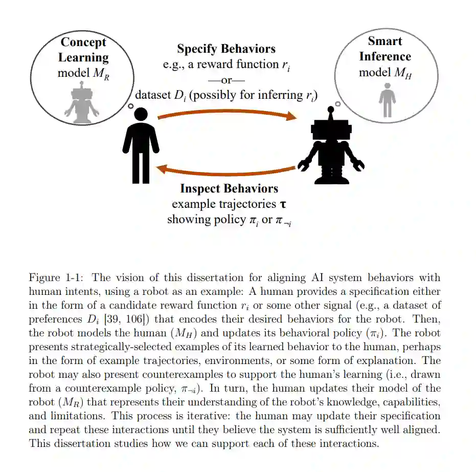 人工智能系统和机器人学习到的行为应当与其人类设计者的意图相对齐。为了达成这一目标,人们——特别是专家——必须能够轻松地指定、检查、建模和修订人工智能系统及机器人行为。这四种互动是人工智能对齐的关键构建模块。在这篇论文中,我研究了这些问题中的每一个。首先,我研究了专家如何为强化学习(RL)编写奖励函数规范。我发现这些规范是相对于RL算法编写的,并不是独立的,而且我发现即使在简单的设置中,专家们经常编写错误的规范,未能编码他们真正的意图。其次,我研究了如何支持人们检查代理的学习行为。为此,我引入了两种相关的贝叶斯推断方法,以找到引发特定系统行为的示例或环境;查看这些示例和环境有助于形成概念模型和系统调试。第三,我研究了认知科学理论,这些理论指导人们如何构建概念模型来解释观察到的代理行为示例。虽然我发现这些理论的一些基础被用于支持人类学习代理行为的典型干预中,但我也发现有很大的空间来构建更好的互动课程——例如,通过展示替代行为的反例。我通过推测这些人工智能交互的构建模块如何结合起来,使人们能够修订他们的规范,并通过这样做,创造更好对齐的代理来结束这篇论文。