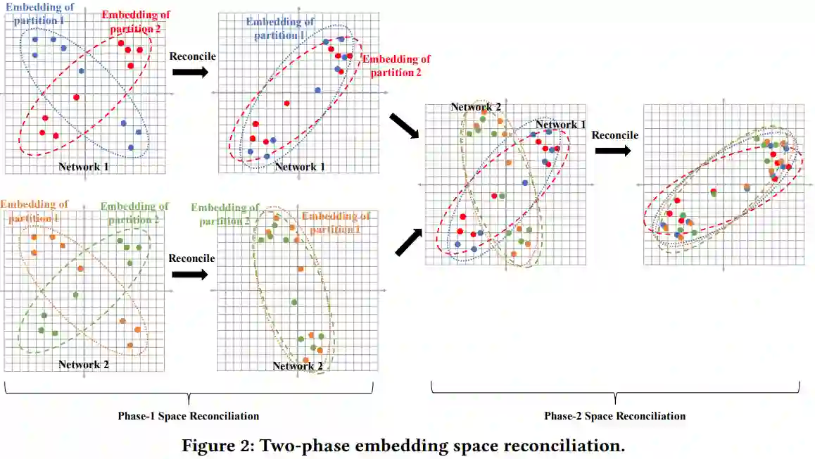 然而,这仍然是一项具有挑战性的任务,因为社交网络是大规模的,有数百万个节点和数十亿个边。传统的集中训练方法由于计算量大,无法适应这样大的网络。为了使MGCN适应于大规模社交网络,提高其可扩展性和效率,我们提出了一种新的训练方法,该方法首先将大规模社交网络分割成簇,然后以完全分散的方式学习网络嵌入。为了对齐不同簇的学习嵌入空间,我们提出了一种新的两相空间协调机制。在第一阶段,我们对齐从同一网络内的每个簇中学习到的嵌入空间。除了不同子网之间的排列在同一网络,推导空间和解对齐两个不同网络通过少量的观测锚节点,这使得我们的MGCN框架实现更精确的锚点链接比最先进的模型和预测效率高在大型社交网络。