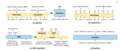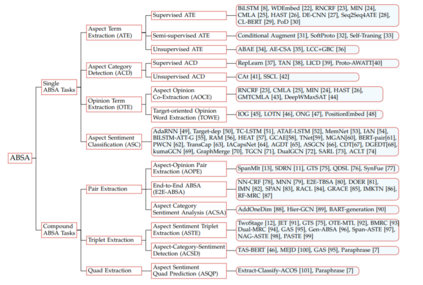 关于ABSA还有其他的综述。现有的一般性情感绪分析研究综述[1,16]对ABSA问题进行了讨论,但并未对最近的进展和挑战进行详细描述。最早的ABSA综述由Schouten和Frasincar[5]进行,全面介绍了2016年以前的ABSA研究,但主要集中在非神经ABSA方法上。Zhou et al. [14], Liu et al. [15], Nazir et al.[6]引入了基于深度学习的ABSA模型。然而,他们的讨论仅局限于单个ABSA任务,在端到端ABSA任务方面有一些开创性的工作。所有ABSA任务的全面回顾,PLM对ABSA问题的影响,以及最近在跨领域/语言迁移方面的进展都没有被涵盖。