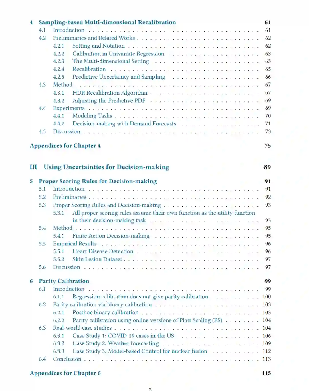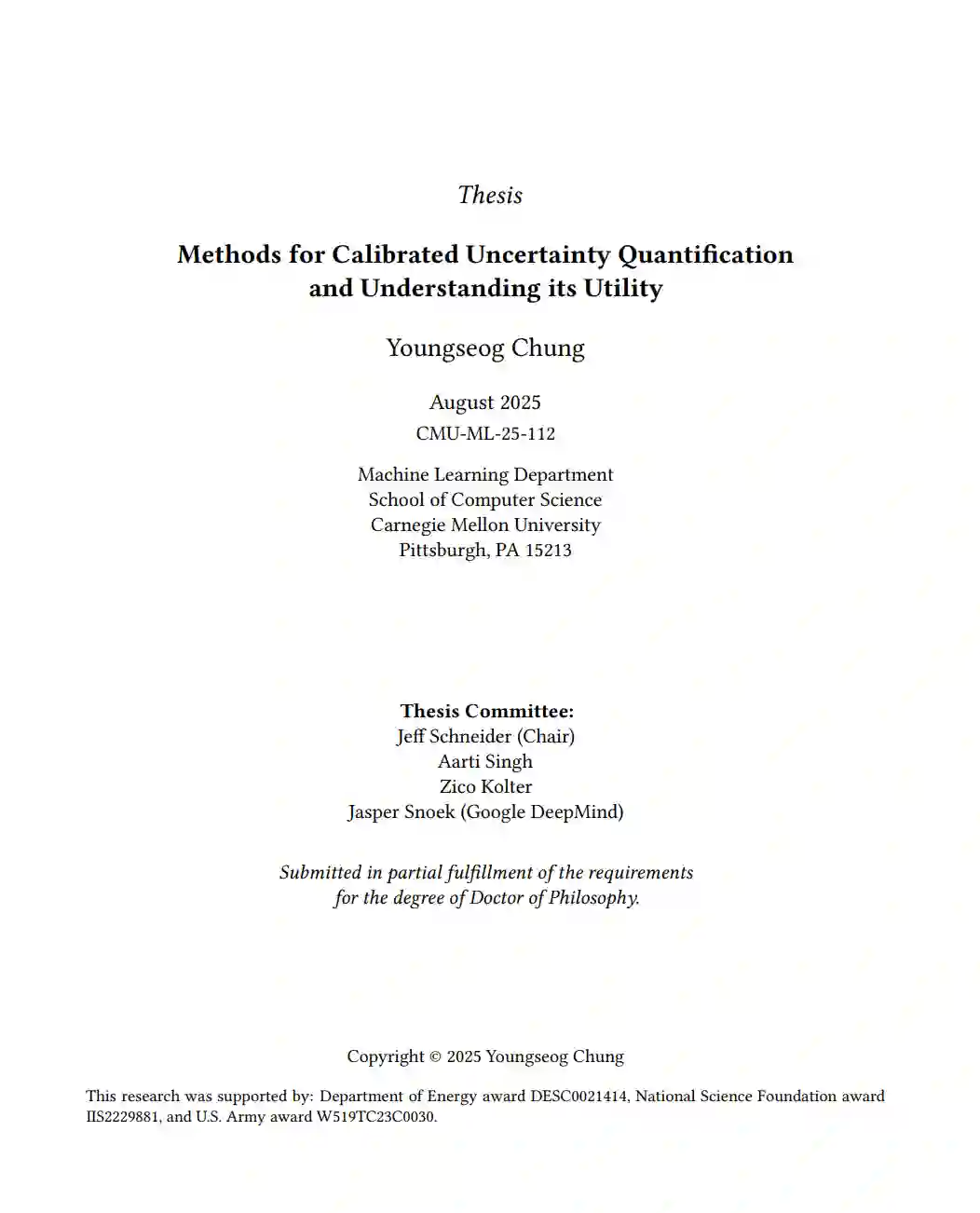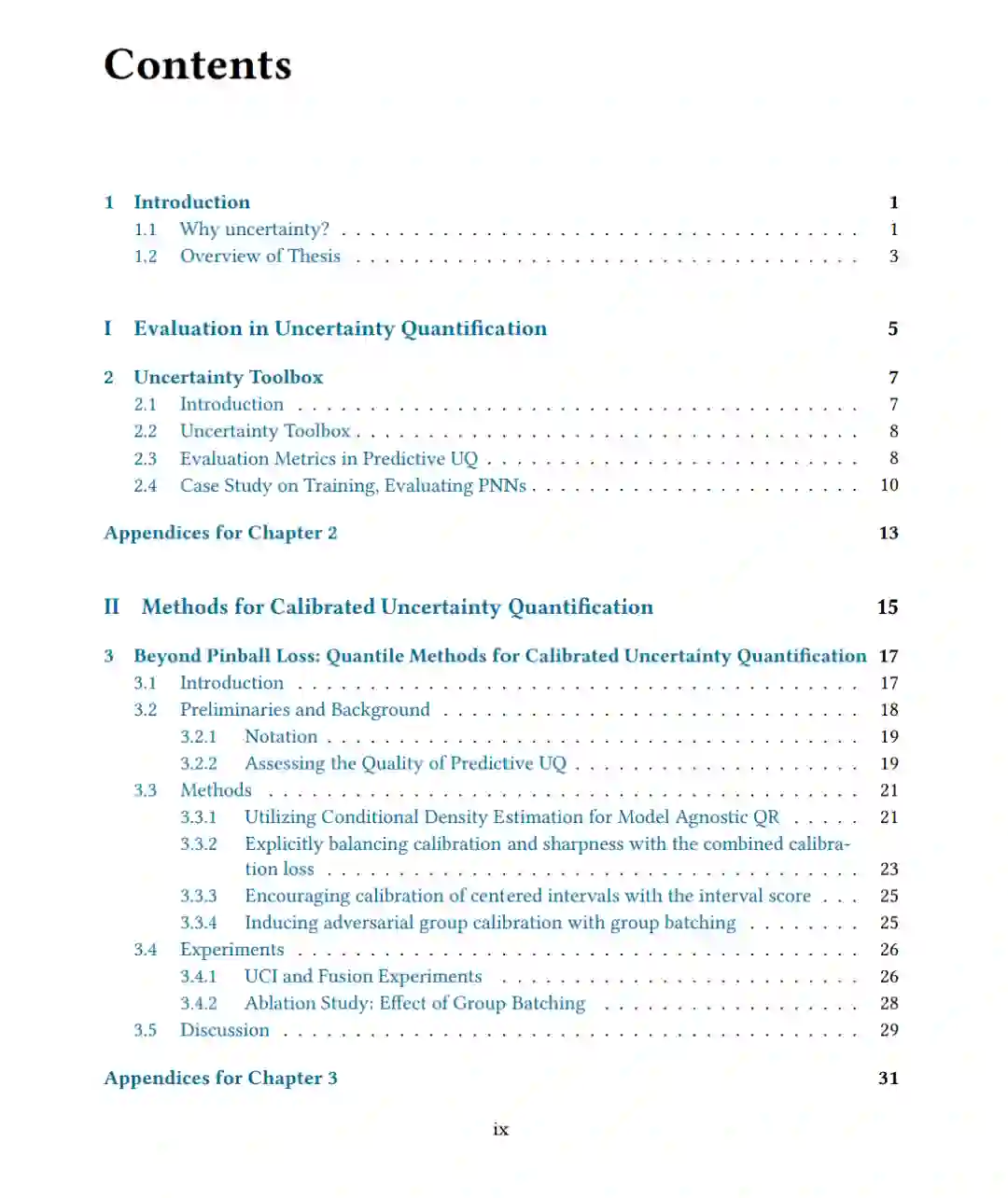 随着机器学习模型在处理复杂数据方面能力的不断提升,它们被赋予了越来越多的预测任务。随着对模型预测依赖性的增强,能够评估某一预测结果是否可靠也变得同样重要。在这一背景下,不确定性量化(Uncertainty Quantification, UQ)扮演着关键角色,它为模型预测提供置信度的度量。 本论文在机器学习中的不确定性量化问题上,分三个阶段展开研究。第一部分综述了 UQ 的评估方法以及开源软件,这些软件为预测不确定性的评估、可视化和再校准提供了多种工具。第二部分讨论了旨在生成校准良好的回归模型预测不确定性的算法,此类模型会对连续值输出生成分布。本部分的第一项工作提出了一套用于训练单变量概率回归模型的算法,而第二项工作则将其扩展到多变量情形。第三部分则聚焦于在决策场景中对预测不确定性的利用。不同的应用环境决定了不确定性的使用方式,我展示了一系列相关研究,涵盖了单步决策、序列决策以及基于模型的强化学习场景。