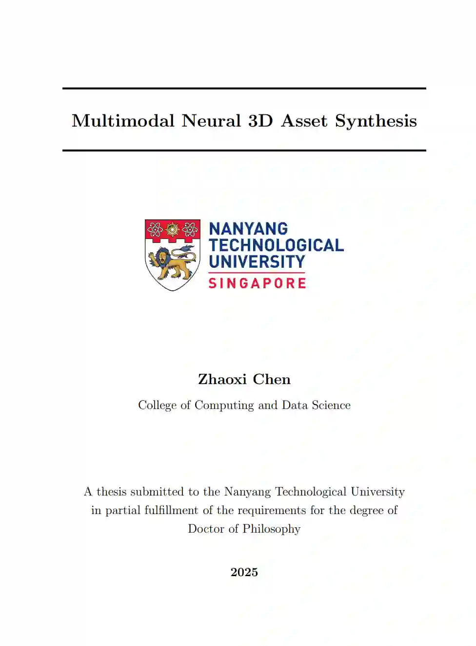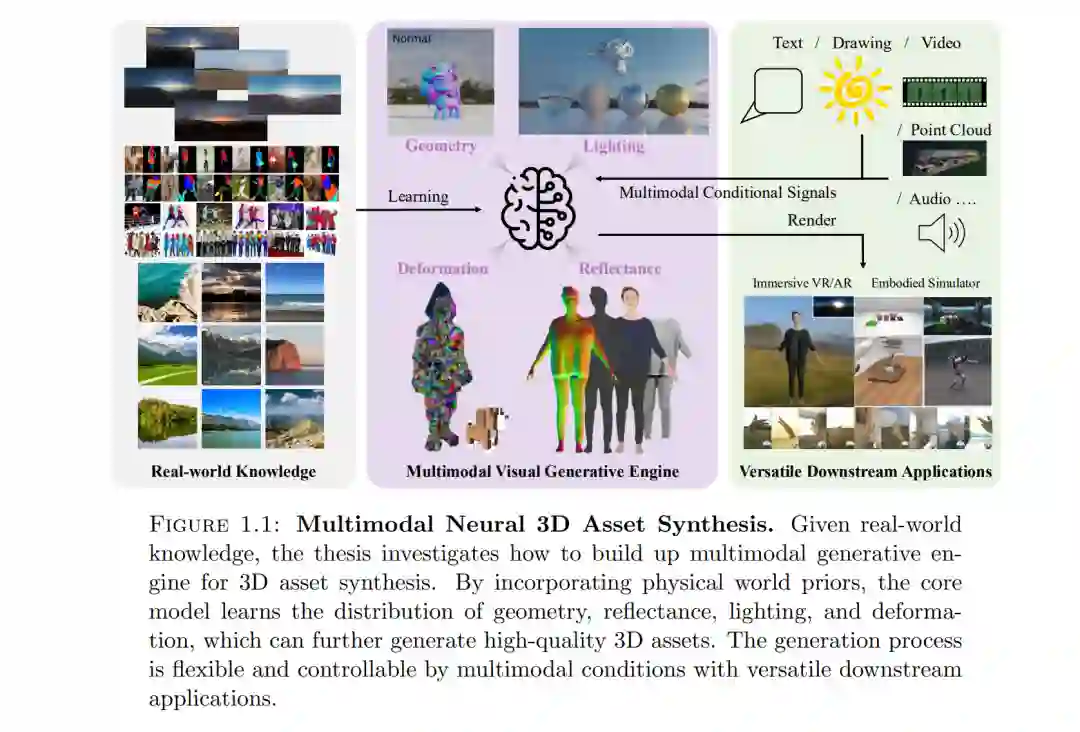 三维资产合成(3D asset synthesis)位于计算机图形学、计算机视觉与人工智能的交叉点,核心目标是创建高质量的三维模型,包括几何结构、纹理、材质以及动画,以支持逼真渲染(photorealistic rendering)。 本论文针对该领域的三个基本挑战展开研究:如何高效地从非结构化数据中学习;如何通过物理先验实现超越训练分布的泛化能力;以及如何灵活地与多模态控制进行对齐。此外,本论文涵盖了三个研究层次:人类级资产合成、场景级辐射生成、以及物体级资产生成,并提出了六种创新方法,共同推动了神经三维资产合成的最新进展。