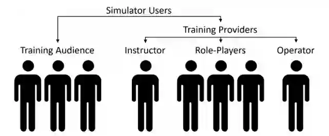 如图1所示,我们可以将培训系统的用户分为两大类:培训受众和培训提供者。培训受众包括那些接受培训的人,如学习如何操作一架新飞机的飞行员,而培训提供者包括那些提供培训的人,如教员、操作员和角色扮演者。教员负责培训课程的教学内容,而角色扮演者和场景操作者则分别作为演员参与或控制模拟场景的一部分,帮助提供培训。如果合成智能体变得更聪明,它们可以取代或增强人类的角色扮演者,并减少培训场景按预期方式进展所需的人类输入量。为了进一步提高系统的自主水平,智能体还可以协助教员评估受训者的表现,并调整培训场景的内容和特点。然而,为智能体创建行为模型是具有挑战性的,特别是对于培训系统的终端用户(如教员),他们可能不具备所需的专业知识和经验[3]。在过去,这限制了智能体在培训中的使用。现在,随着人工智能(AI)的最新进展,人们希望数据驱动的方法能够简化构建智能体的过程,从而在基于模拟的培训中取代人类支持人员。