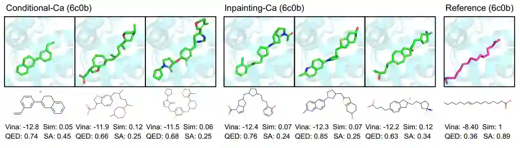 图4 在 Binding MOAD 上训练的DiffSBDD模型针对人类受体蛋白(PDB:6c0b)进行了评估。比较了条件和修复方法(两者都是),并给出了每个模型中亲和力最高的三个分子。