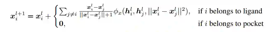 作者使用 EGNN 对噪声预测器 进行参数化。为了使用单个 GNN 处理配体和口袋节点,原子类型和残基类型首先通过单独的可学习 MLP 嵌入到一个联合节点的嵌入空间中,并且将坐标更新步骤确定为以下内容: