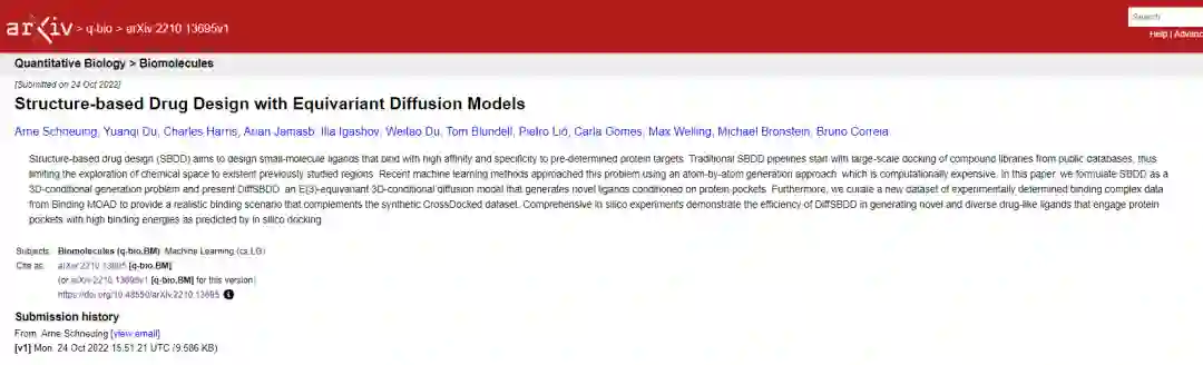 审稿|侯琳琳 今天给大家带来的是洛桑联邦理工学院(EPFL)联合微软研究院Max Welling课题组、牛津、剑桥、康奈尔等团队于2022年10月发表在arxiv上的预印本《Structure-based Drug Design with Equivariant Diffusion Models》。在本文中作者将基于结构的药物设计(SBDD)表述为一个3D条件生成问题,并提出了DiffSBDD,一个 E(3)等变的3D条件扩散模型,它关于平移、旋转、反射和排列等变,并可以根据蛋白质口袋的条件生成新的配体。