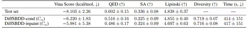 表 1中的实验结果表明,DiffSBDD 可以生成具有预测的高结合亲和力的多种小分子化合物,符合最先进的性能。我们没有看到条件模型和修复方法之间的显著差异。多样性分数可以说是最有趣的,因为这表明与以前的方法相比,作者的模型能够采样更多的化学空间,同时保持高结合性能,这是早期基于结构的先导发现中最重要的要求之一。