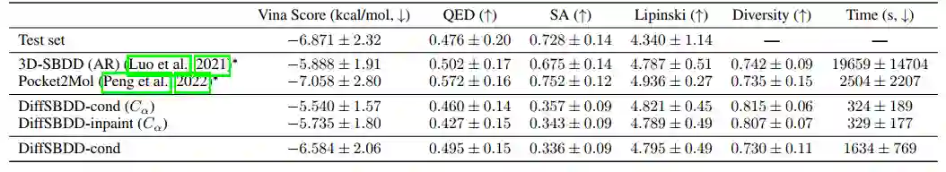 表 2 对来自 Binding MOAD 测试集的目标口袋生成的分子的评估