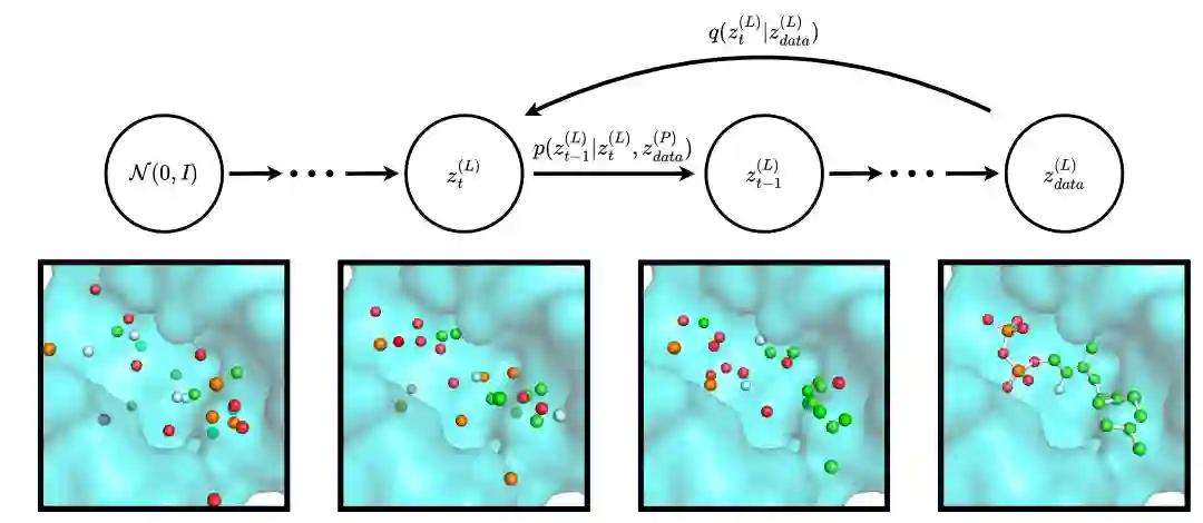在条件分子的生成设置中,作者在去噪过程的每个步骤中都提供固定的三维上下文。为此,作者用上标 P 表示的蛋白质口袋节点来补充,用上标 L 表示的配体节点点云,并且在整个反向扩散过程中保持不变(图 2)。