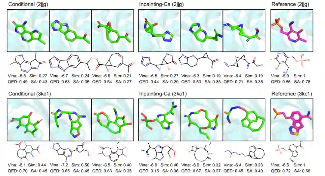 图3 在CrossDocked上训练DiffSBDD模型,并针对氨基转移酶(top,PDB:2jjg)和水解酶(bottom,PDB:3kc1)进行评估。比较了条件和修复方法(分别使用全原子和级蛋白质表示),并展示了每个模型的三个高亲和力分子。’Sim’是生成的配体和参考配体之间的Tanimoto相似度