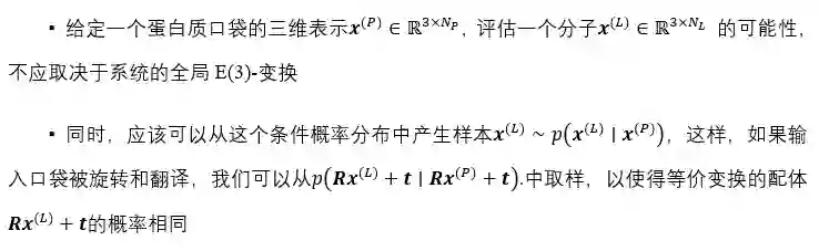 等变性 在具有3D条件的概率设置中,作者希望在以下意义上确保E(3)-等变: