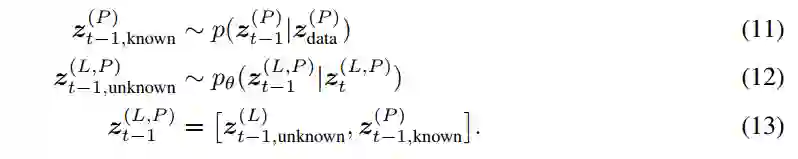 作者首先训练一个无条件的 DDPM 来近似配体和口袋节点的联合分布。这使能够在没有额外上下文的情况下对新对进行采样。为了以目标蛋白质袋为条件,需要通过修改概率转换步骤将上下文注入采样过程。在扩散步骤t-1, 蛋白质口袋和配体相组合的潜在表示,是从口袋的前向噪声版本组装而成的,该版本是与 DDPM 根据步骤t的上一个潜在表示预测的配体节点相结合。