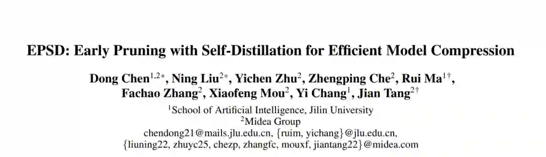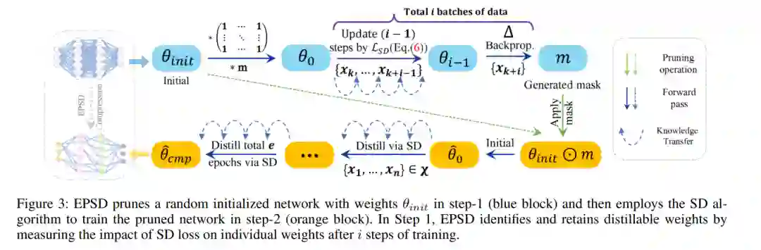 神经网络压缩技术,如知识蒸馏(KD)和网络剪枝,已日益受到关注。最近的工作“先剪枝,再蒸馏”揭示了一个被剪枝过的对学生友好的教师网络可以提高KD的性能。然而,传统的教师-学生流程,需要对教师进行繁琐的预训练和复杂的压缩步骤,使得结合KD的剪枝效率较低。除了压缩模型,最近的压缩技术也强调效率方面。早期剪枝与传统剪枝方法相比,需要的计算成本显著较低,因为它不需要一个大的预训练模型。同样,KD的一个特殊情况,称为自蒸馏(SD),更为高效,因为它不需要预训练或学生-教师对的选择。这激发了我们将早期剪枝与SD结合起来进行高效模型压缩的想法。在这项工作中,我们提出了一个名为早期剪枝与自我蒸馏(EPSD)的框架,该框架在给定的SD任务中识别并保留早期剪枝的可蒸馏权重。EPSD有效地将早期剪枝和自我蒸馏结合在一个两步过程中,保持了剪枝网络的可训练性以进行压缩。EPSD不是简单地组合剪枝和SD,而是通过在训练前保留更多可蒸馏的权重使剪枝网络更倾向于SD,以确保更好的剪枝网络蒸馏。我们证明EPSD改进了剪枝网络的训练,通过视觉和定量分析得到支持。我们的评估涵盖了多样的基准(CIFAR-10/100, Tiny-ImageNet, 全尺寸ImageNet, CUB-200-2011和Pascal VOC),EPSD的表现超过了先进的剪枝和SD技术。
