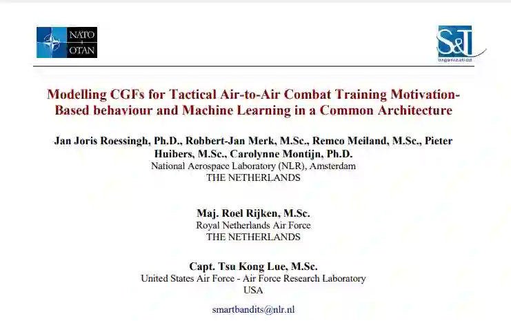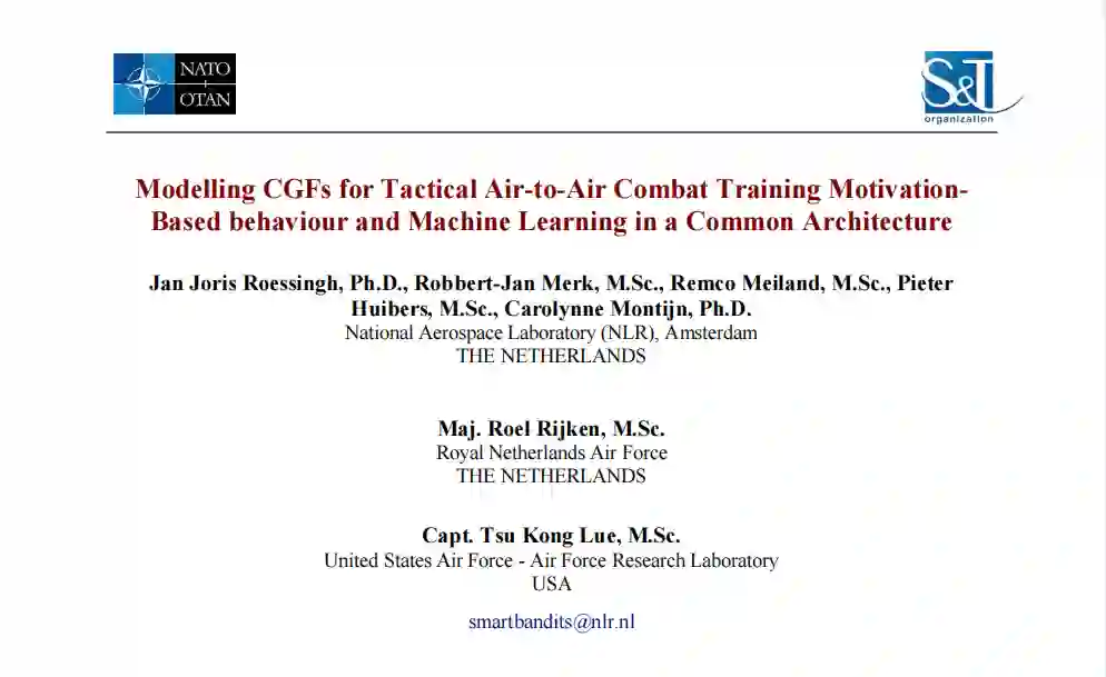 本文的目标是说明在 "智能强盗 "项目(2010-2013年)中开发智能CGFs。该项目旨在将类似人类的智能植入模拟任务场景中出现的CGF中。通过Smart Bandits项目,荷兰国家航空航天实验室(NLR)和荷兰皇家空军(RNLAF)的目标是在模拟战术战斗机飞行员训练领域迈出重要一步。本文的核心信息是,认知模型是在CGF中创造基于动机的行为的有力手段。然而,为了减轻认知建模的缺点,我们主张额外使用ML技术。这些技术对于减少开发在复杂领域中行动的代理的知识诱导工作至关重要。它展示了如何将不同的方法组合成混合模型。