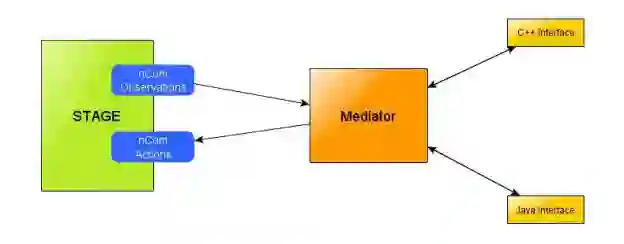 为了将STAGE作为Smart Bandits中的CGF平台,同时将CGF的控制权委托给外部软件(即使用选择的编程语言构建的特定软件),我们开发了一个接口,外部软件可以通过该接口接收来自STAGE中任何CGF的观察结果,并可以命令CGF在仿真环境中执行操作。这个中间件层(图3中所谓的调解器)通过特定的协议(nCom,Presagis专有)与STAGE进行实时通信,可以向不同的代理(可能分布在不同的计算机上)发送和接收上述的观察和行动。为了与调解器通信,外部软件使用一个特定的接口,该接口定义在一个库中,可以很容易地链接到软件中,例如用Java或C++。