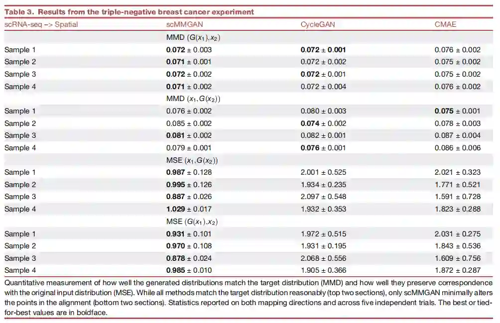 作者在广泛的数据类型上展示了用scMMGAN对齐数据模式的能力。首先在有同步测量的数据集上对其进行验证,并在评估中使用这些数据作为基本事实。然后作何使用scMMGAN对一个新的三阴性乳腺癌数据集进行了彻底的调查,作者将乳腺癌培养物HCC38的细胞异种到小鼠体内,并允许其从原发肿瘤位置转移到次发肿瘤位置。结果表明,scMMGAN可以推断出细胞结构的空间位置。