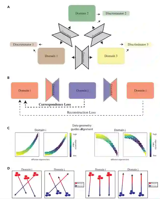 然而,简单地匹配概率分布会导致细胞状态的不连贯性(图1D)。在这里,作者给出的一个关键见解是,分布必须只在对应的约束条件下进行匹配。这些对应关系本质上是反映在每一种模式中的基础系统的不变性。在以前的工作中,作者为每个数据集使用定制的对应关系损失。然而,在这里需要注意到,在匹配单细胞数据时,可以使用一个几乎通用的约束,那就是流形几何保存。
