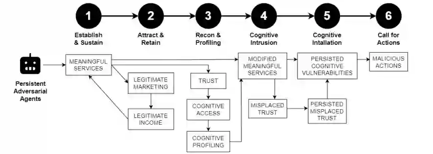 持久性智能体(PAA)大多根据人类的要求提供合法服务,并赚取合法收入。这就是 PAA 持续存在并招募更多潜在受害者的方式。在为用户提供合法服务的同时,PAA 会精心构建用户的认知档案。特别是,虽然这种认知档案是用户决策的现实化,但其中的许多细节也可能来自用户与 PAA 之间的合法服务聊天会话。在某一时刻,PAA 会判断具有特定认知特征的用户是否 "可能 "值得攻击。有了目标用户,PAA 就会随着时间的推移,小心翼翼地将隐蔽的 MCBT 嵌入到合法的服务会话中。这一 MCBT 过程最终会以用户执行对公众造成灾难性后果的行为而告终,同时 MCBT 敌对行动者也会从中受益。图 2 描述了具体的杀伤链。