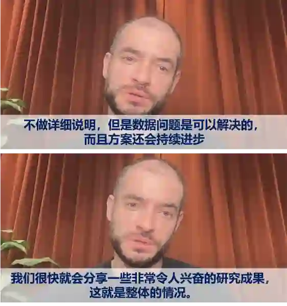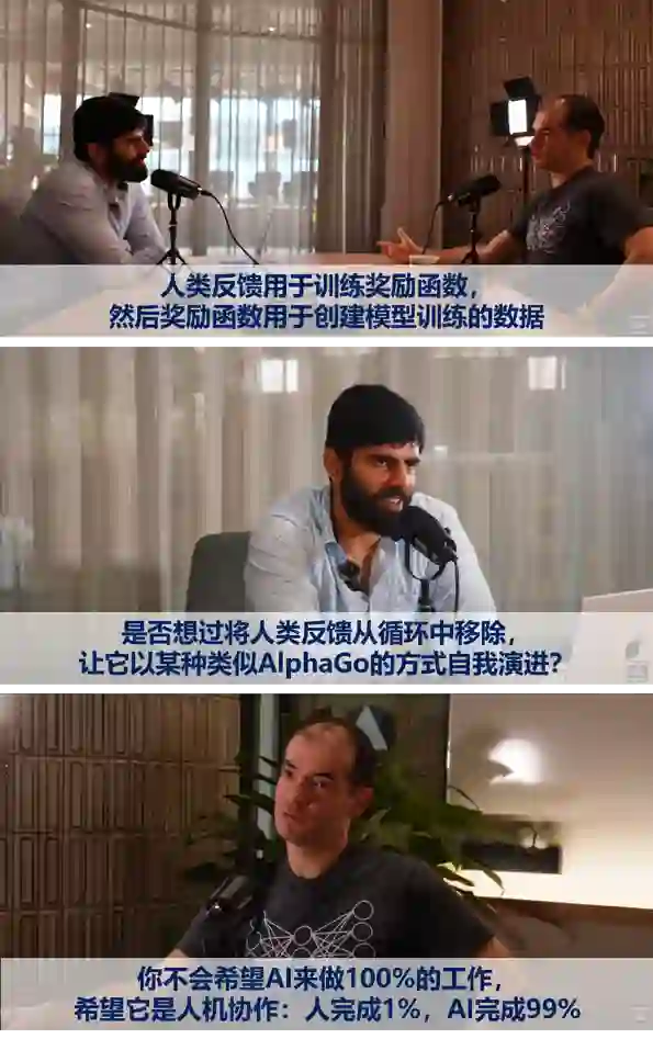 回到关于Q的讨论。预训练和强化学习结合的一个挑战是如何获取奖励数据。猜测一采用的是模型自动标注的合成数据。参考AlphaGo的奖励设计方式,应该如何获取奖励数据才能超越人类已有知识的约束?让我们试着从IIya Suskever身上寻找答案。首先是两个访谈。今年3月的一个访谈中[D6],IIya介绍了RLHF中人训练奖励函数然后奖励函数训练模型的原理,主持人Dwarkesh Patel随即非常犀利地问到:“是否有可能将人类反馈从循环中移除,以类似AlphaGo的方式自我演进?”IIya并没有正面回答,而是从安全的角度回避了这个问题(图6)。在今年11月初的另一个访谈中[D7],主持人问模型能力持续提升的主要推动力是什么?IIya毫不犹豫地说是数据,但又接着说:“不详细说明,我只想说数据限制是可以克服的。”(图7)在访谈的后面,IIya提到:“我们最近会发布一个非常令人兴奋的研究成果。”不得不令人遐想这和十多天之后宫斗以及Q传闻的关系。不过自从ChatGPT发布甚至是GPT-3之后,OpenAI就开始对技术语焉不详,我们很难从中找到想要的答案。