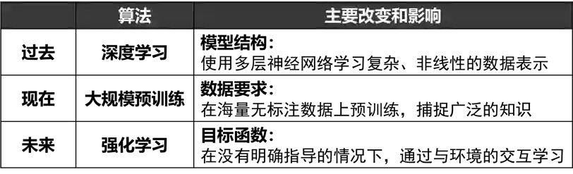 关于预训练和强化学习的结合,我们再拉远一点视角。图4是OpenAI研究员Hyung Won Chung今年10月在首尔国立大学报告[D5]中的一页slide,从手工设计和自动学习模块的变化总结了人工智能从专家系统、传统机器学习、深度(监督)学习到深度强化学习的转变。其中强化学习为深度学习带来了可以学习的目标函数。这隐隐让我有种感觉,如果说深度学习代表了过去(虽然这个过去也不远)、预训练代表了现在,难道强化学习代表了(不远的)未来?它们分别对应了模型结构、数据要求和目标函数的变革(图5)。深度学习已经分别与预训练和强化学习进行了较好的融合,将预训练和强化学习融合可能是一个潜力巨大的研究方向。预训练对人类已有知识和经验压缩,其受限于概率建模的约束,创造未知知识的小概率事件很难发生。强化学习通过平衡利用和探索,通过增加随机性,有潜力打破LLM依赖人类设计的局限,实现更高层次的智能。进一步,预训练对应连接主义、强化对应行为主义,如果将思维树等有系统二思想的结构化推理看成是一种符号系统,Q*也算是三种主义一次有趣的重逢,这样的结合不仅能够从数据中学习复杂的模式,还能进行结构化的思考和决策,有望提高AI的适应性、灵活性和解释性。