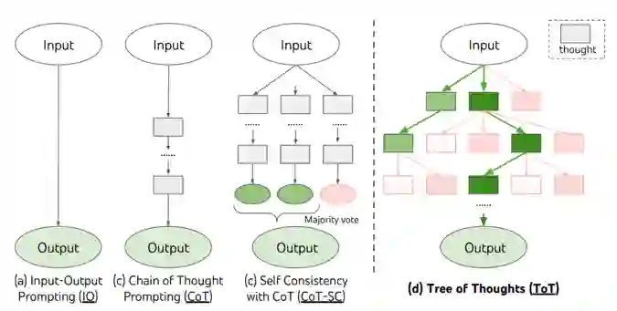 Nathan Lambert的这篇博客[D2]算是对猜测一的集大成讨论。 对于Q*,很多人都联想到了Q-learning和A*,所以也自然把Q*和强化学习以及搜索联系在了一起。具体到搜索如何与强化结合,要从RLHF中简化的bandit问题说起。在InstructGPT实现的标准RLHF中,预测序列token的行为奖励是独立分配的,即输出的每个token都共享整个response的奖励。这没有利用强化学习在序列决策建模方面的潜力。 最近从思维链发展出的思维树提示(Tree-of-Thought,ToT[L1])提供了可能的解决思路。思维树模拟人类的推理过程,将问题求解定义为树上的搜索问题,相比思维链允许采用不同的思维路径(图1),在24点等需要复杂推理的任务上获得了不错的结果。思维树是为推理阶段的提示优化提出的。在与预训练以及强化学习结合时,可以将RLHF使用的策略函数以策略树的形式实现(图2):给定prompt(状态s),生成response(动作a)的过程通过思维树分解为多条、多步的推理路径。推理路径构成马尔科夫链,通过为每一步推理赋予价值,从而提高LLM的推理求解能力。这里的价值可以看成是推理过程中的奖励,与OpenAI在今年5月提出的过程监督奖励(process-supervised reward[L2])有着相似之处。