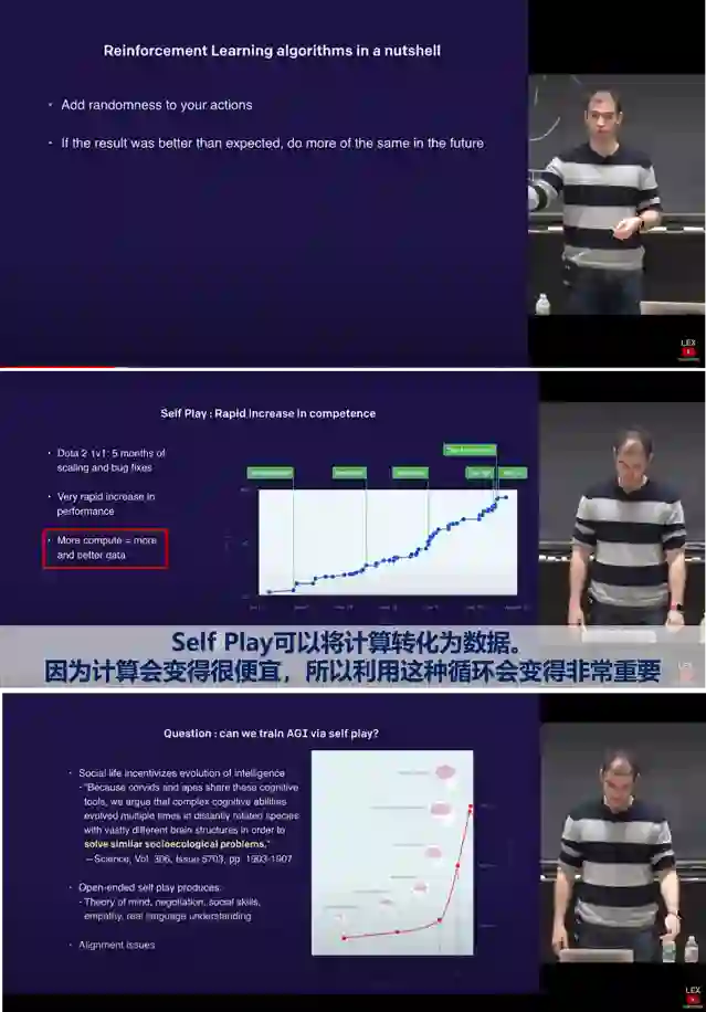 答案可能要从更久的资料中去找。2018年初IIya在MIT作了一个题为“Meta Learning & Self Play”的报告[D8]。报告首先令人印象深刻的是他对强化学习的理解,他认为相比监督学习的确定性目标(包括自监督学习),强化学习的本质是“为动作增加一点随机性,如果结果好,未来就继续执行这个动作”(图8上),个人认为这个认知是非常深刻的。其次,IIya那时对元学习的关注就不是小样本学习这种类别层的泛化,而是“在多个任务训练,然后解决未见过的任务”的任务层的泛化,为后来指令学习的实践和任务涌现奠定了基础。 报告的后半部分是猜测二的主角:Self Play自我博弈。在演示了多个自我博弈的应用视频后,IIya先用一句话精辟总结了自我博弈的作用:自我博弈可以将计算转化为数据(图8中)。然后对自我博弈能否实现AGI给出了肯定的回答:“开放式的自我博弈可以产生心智、社交能力和真正的语言理解”(图8下)。报告后的QA环节也信息量巨大,问题和回答同样精彩,快6年之后再来考古,当时的很多对话都让人起鸡皮疙瘩。不过除了QA环节的一个问题,整个讲座IIya都没有提语言建模,这也让Q*项目有了超越大语言模型的可能:不要忘了OpenAI早年的重心是在让AI控制鼠标键盘 (OpenAI Universe)、深度强化智能体(OpenAI Gym、OpenAI Five)和模仿机械手(Dactyl)这些项目上。如果和虚拟现实模拟各种环境结合,会有很多想象空间。