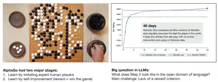 从Andrej Karpathy11月的一个报告说起[D4]。在谈到未来值得关注的方向时,Andrej Karpathy比较了AlphaGo和LLM(图3):AlphaGO的训练除了模仿学习还有自我博弈强化,从而探索出了超越人类经验的策略;相比之下,LLM只有模仿学习,依赖大规模的语料库学习,这些语料库基本上是人类知识和交流的集合,主要反映和模仿人类已有的知识和表达方式。