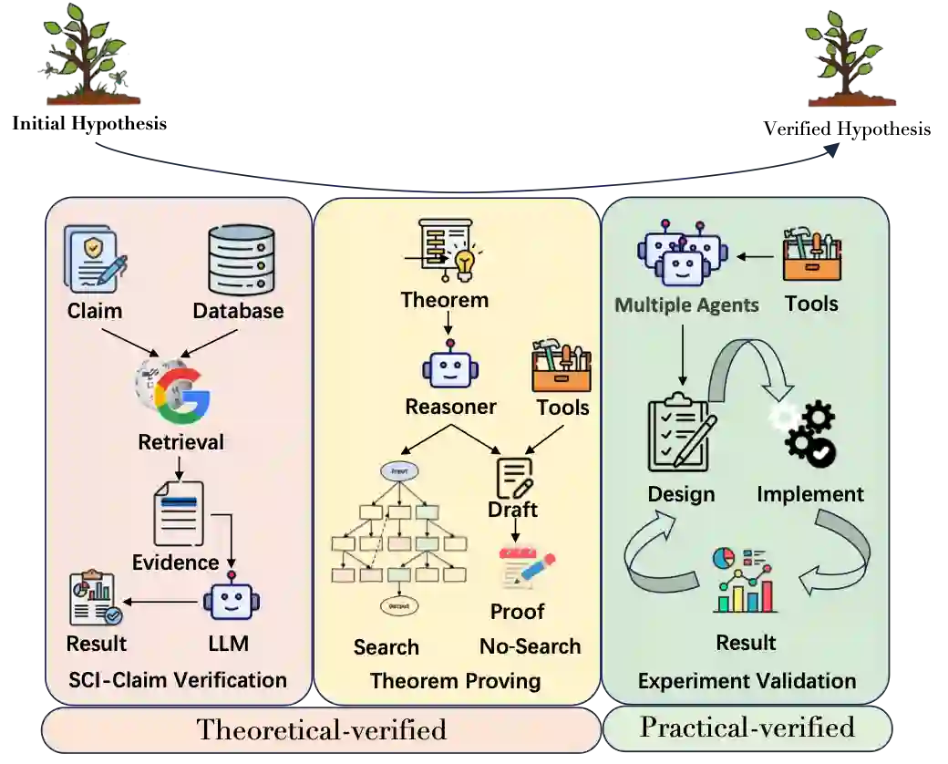 在科学研究中,提出的假设并不总是正确,可能存在理论性错误或者实践性错误,任何提出的假设都必须经过严格的验证来确定其有效性,在某些研究中,这一过程也被称为“证伪”[22]。具体来说,科学声明验证和定理证明通过形式推理和逻辑演绎提供对假设的理论验证,而实验验证则通过实证测试提供全面的实践验证。