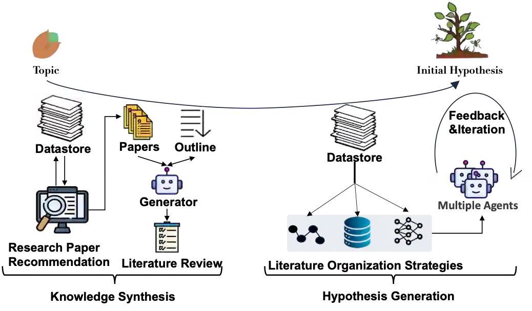 知识整合构成了研究过程的基础步骤。在此阶段,研究人员需要获取现有文献,并批判性地评估现有文献,建立对领域的深入理解。这一步骤对于发现新的研究方向、完善方法论以及得出有理有据的决策至关重要。 获取一个领域相关的文献是理解该领域的重要起点,常见的工具包括检索引擎与推荐系统。先前的研究已经表明,推荐系统在从大规模数据集中提取有价值见解时,在效率和可靠性方面优于基于关键词的搜索引擎[14]。早期的研究遵循常规的推荐系统范式,可以分为基于内容过滤、协同过滤、基于图的方法以及混合系统,这些系统多以论文为中心。而近期的研究更加强调“以用户为中心”的设计理念,如构建作者关系图[15]或利用 LLM 推理用户研究兴趣,从而实现个性化推荐。此外,在推荐内容的呈现方面,也从简单的“推荐了什么”,扩展到“为何推荐”以及“与用户已知文献的差异性”[16],提升了系统的透明度与用户体验。 获取某个领域的文献集合后还需要深入理解该领域。系统性地阅读文献并进行综述,是一种严谨且结构化的方法,旨在评估与整合特定主题的现有研究成果。与单一文档摘要不同,文献综述的核心在于对多篇相关科学文献信息进行综合。当前主流方法通常将综述过程分为两步:大纲生成与内容生成。近期研究强调,结构化大纲的生成能显著提升综述的连贯性[17]。实现结构化大纲的常用策略包括:运用聚类算法构建多级子标题,或利用 LLM 初步草拟大纲,再通过多智能体系统讨论迭代优化。此外,多层次树状结构也被证明是系统化知识表示的有效框架。内容生成紧随大纲之后,其核心任务是依据大纲指引,通过检索相关文献或整合外部知识图谱等方式获取知识,并采用迭代机制持续提升生成内容的质量。