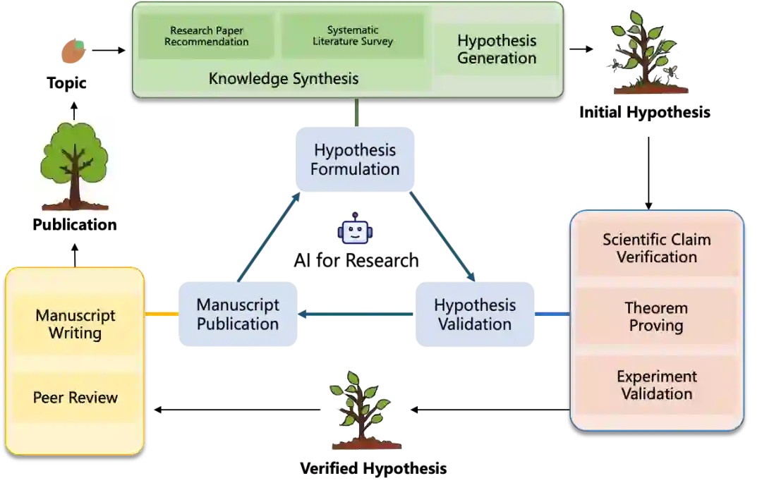 科学研究是一项旨在拓展人类知识、推动文明进步的系统性与创造性工作[1]。研究人员通常需要确定研究主题,回顾相关文献,综合已有知识,提出研究假设,并通过理论分析与实证方法进行验证。研究成果通常以论文形式呈现,在发表前还需接受严格的同行评审[2]。然而,这一过程不仅耗时耗力,还对研究者的专业素养与认知能力提出了极高要求,构成了科研实践中需要突破的瓶颈[3]。 近年来,以大型语言模型(Large Language Models, LLM)为代表的人工智能(AI)技术迅猛发展,在文本理解、推理与生成等方面展现出卓越能力(如 DeepSeek-R1[4])。在此背景下,越来越多的研究人员开始探索如何将 AI 技术融入科研工作流程,从文献综述、假设生成与验证,到论文撰写与审稿,人工智能正在以多种形式深度参与科研活动。如何对这些方法进行划分介绍,同时使用AI参与科研可能存在哪些问题,是目前亟待被探究的问题。 本文将首先概述 AI 参与科学研究的背景,随后以模拟人类科研行为的视角,将AI在科研领域的应用归为三个阶段:假设提出,假设验证与成果发布。随后介绍相关技术在不同科研阶段的应用进展,并进一步讨论未来的改进方向与潜在伦理问题。
