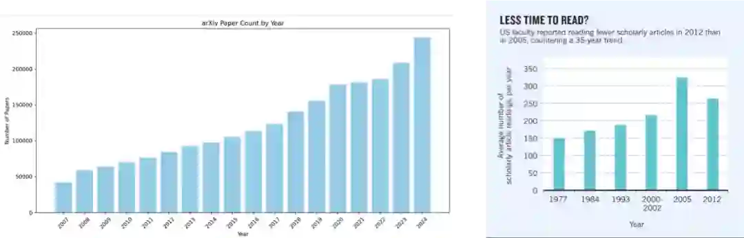 当前科研领域正面临前所未有的信息过载危机。数据显示,arXiv 上每年的论文投稿数量持续攀升,2024 年的投稿量已接近 2007 年的 5 倍。然而,与此形成鲜明对比的是,科研人员的阅读能力并未显著提高。研究表明,科研人员每年平均只能阅读约 300 篇论文[5],这一数据在过去几十年中几乎没有变化。论文数量的激增与阅读能力的相对停滞之间的矛盾,正在显著加剧科研人员在信息获取方面的负担。