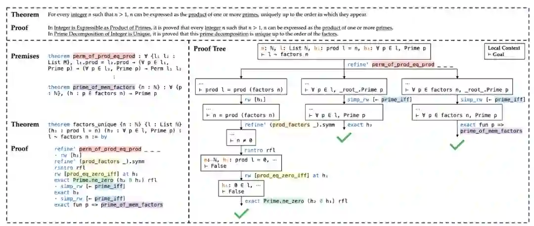 形式化定理证明:使用编程语言(如 Lean 4)或逻辑系统,以机器可验证的精确格式表示定理及其证明。通常会使用分层或者树搜索的方式对定理进行迭代的证明[28]。