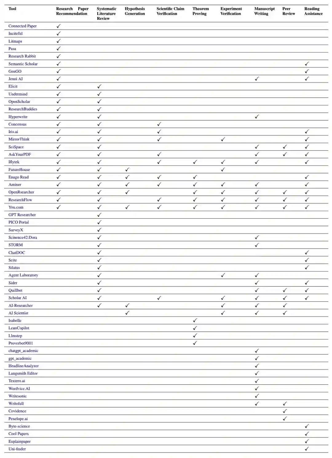此外,我们汇总整理了现有可直接应用(开箱即用)的工具资源,并简单概括了其功能。具体工具列表及链接可以访问: https://github.com/zkzhou126/AI-for-Research