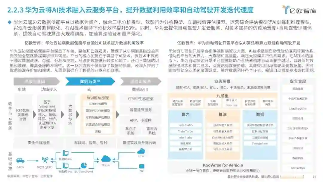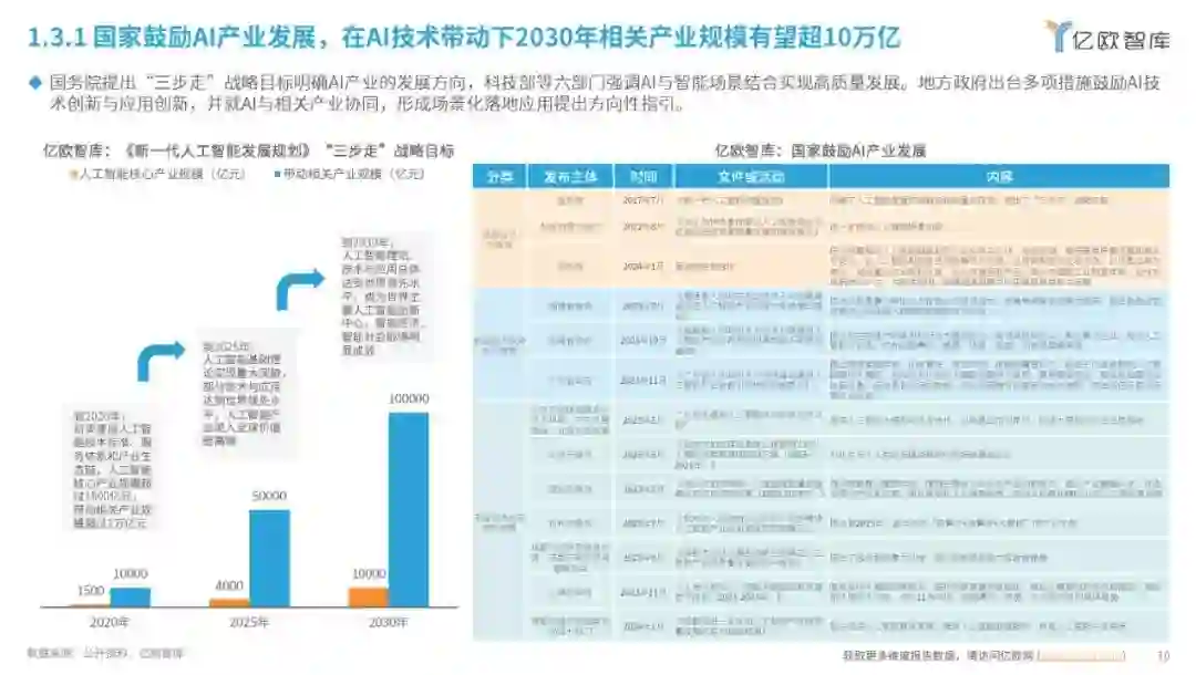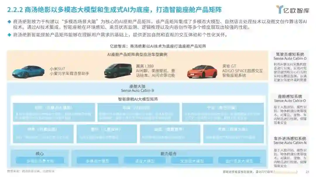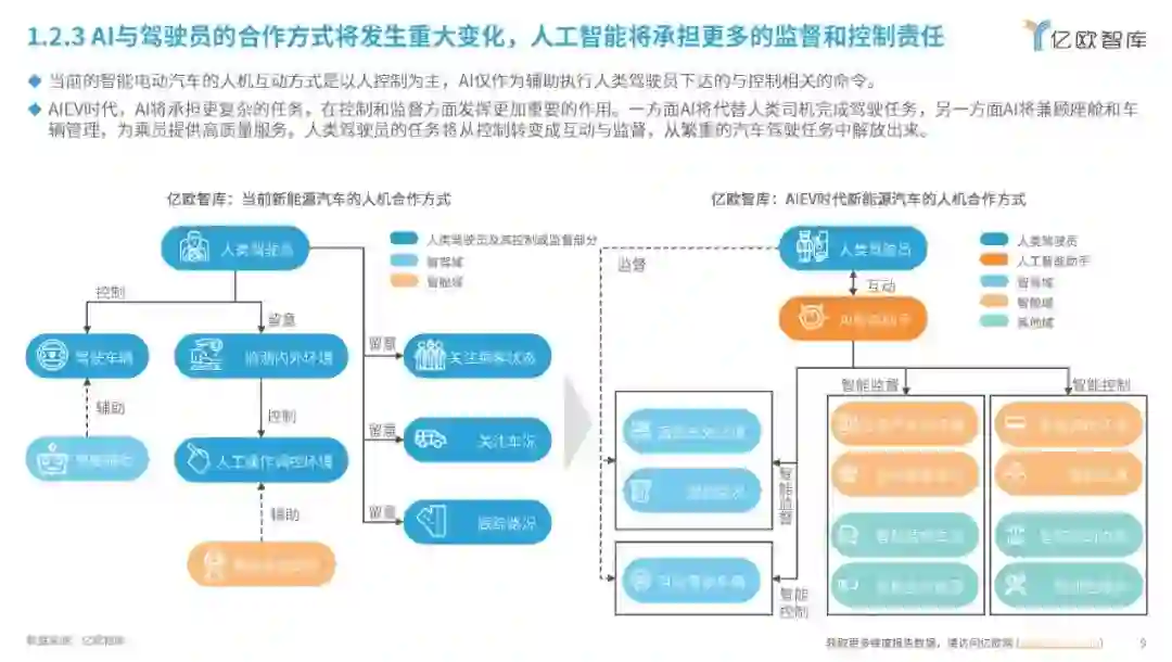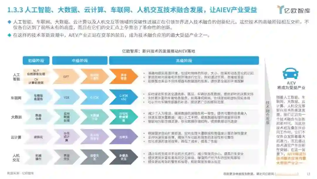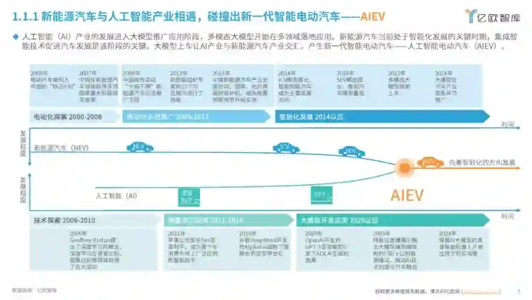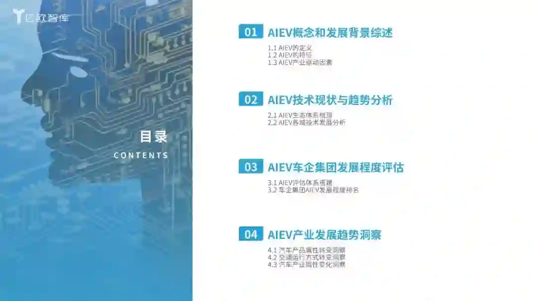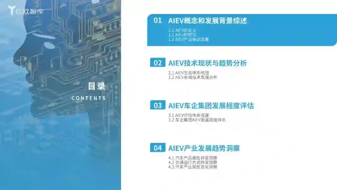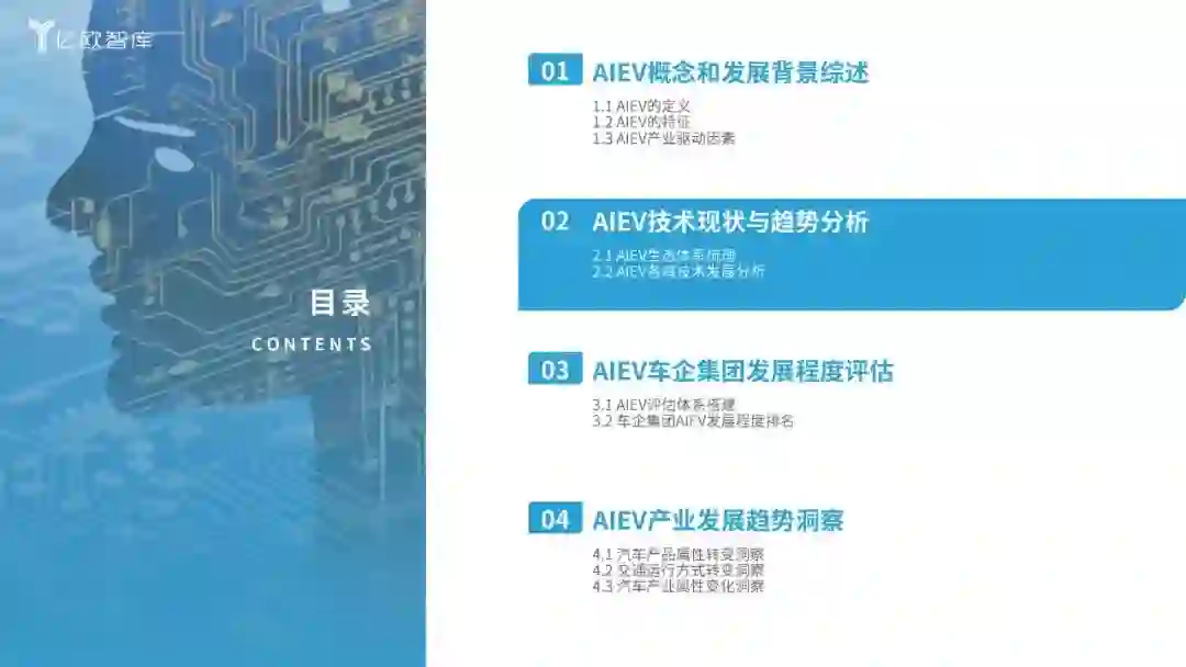 与此同时,人工智能(AI)领域正在发生巨大的变化,大模型的推出标志着AI产业进入了技术大规模落地应用的新阶段,具有巨大潜力的先进技术吸引各方资源汇聚形成了一个完整的产业生态。AI产业将应用在各行各业,促使传统产业完成智能化改造,实现新技术加持下的效率提升和质量优化。 2023年多模态大模型的上车应用让汽车与AI两个产业交汇,汽车与AI融合催生出新一代的智能电动汽车一一人工智能电动汽车(AIEV)。AIEV的诞生,不仅是技术融合的产物,更是产业发展的必然超势。它代表了汽车产业与人工智能产业深度融合的成果,预示着汽车产业将迈向一个更加智能化、个性化的未来。AIEV的发展,不仅能够为消费者提供更加安全、便捷、舒适的驾乘体验,也将为汽车产业带来新的增长动力和市场机遇。随着技术的不断成熟和市场的逐步扩大,AIEV有望成为推动汽车产业转型升级的重要力量,引领行业进入一个全新的发展阶段。 核心观点 AIEV通过深度集成AI技术实现汽车智能化程度的提升,它预示着AI技术对传统汽车产品的重大改变。AIEV加速电子电气架构向中央集中式转变,让汽车SOA软件框架形或新的组合方式,并促使AI与驾乘人员的合作方式发生重大变化。 中国智能汽车行业围绕AI技术构建新生态体系,当前智驾、智舱和车云领域发展较快,预计未来各域AI化发展将更加均衡,在此基础上有望形成全域统一控制的新生态。 中国车企集团AIEV综合发展程度较高,汽车各域AI化水平发展较为均衡。中国车企在汽车各域AI上车应用方面展现出产品优势,智算中心的加速建设缩小了其与外国智能电动汽车头部车企的算力差距,与科技公司、友商、高校的生态合作增强了其AI技术应用能力。 AI技术加持下,汽车产品属性加速向智能化服务新空间和移动计算中心转变。交通运行方式将在AI技术辅助下变化,汽车智能化队列协同行驶将提升交通运行效率。汽车产业向科技加消费电子转变,车企的AI技术实力正在成为竞争的核心要素。