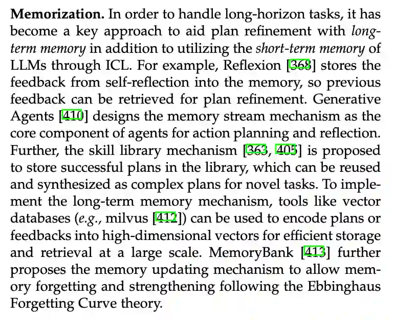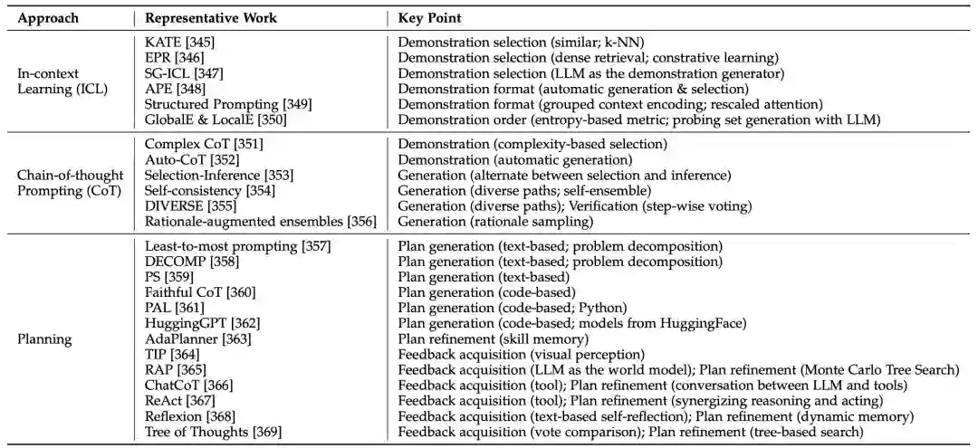 经过预训练或适应性调整后,使用LLM的一个主要方法是设计合适的提示策略来解决各种任务。我们新增了表9对现有提示的代表性工作进行了总结,包括典型的LLM运用方法及其ICL、CoT和规划的重点。 此外,为了处理长程任务,使用长期记忆帮助进行规划是一类重要的方法。我们新增了目前使用记忆机制进行规划的工作,包括反思(Reflexion)和MemoryBank等。