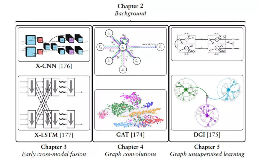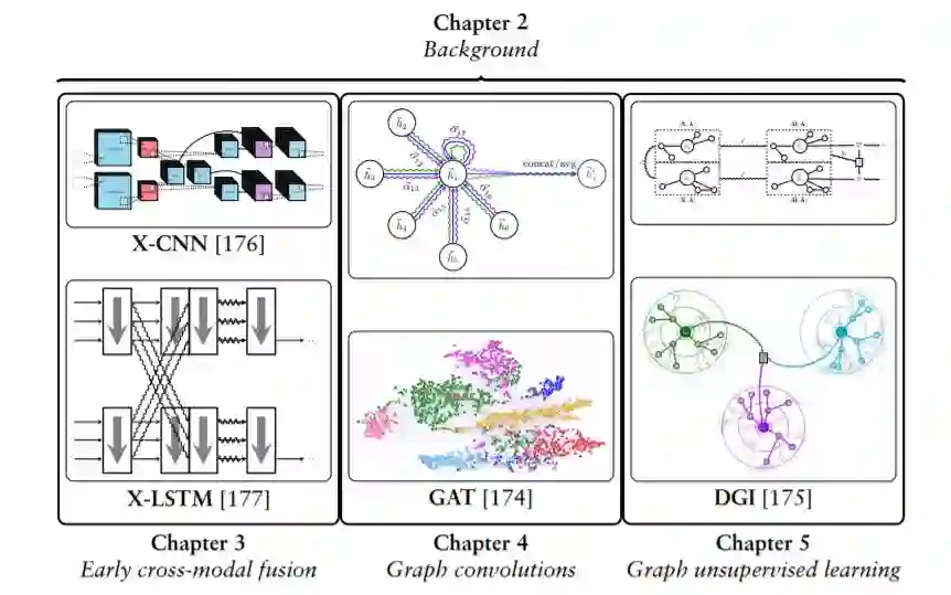 本文主要贡献的概述。首先,提出了两种具有特殊结构诱导偏差的多模态学习早期融合模型;一个用于网格结构输入模式(X‐CNN[176]),另一个用于顺序输入模式(X‐LSTM[177])。接下来,图卷积层的理想结构偏差在图注意力网络(GAT[174])模型中得到了应用,并且第一次同时得到了满意的结果。最后,通过Deep Graph Infomax (DGI[175])算法成功地引入了局部互信息最大化,将其作为一个无监督学习目标用于图的结构输入,允许在学习节点表示时结合图卷积编码器引入非常强大的结构诱导偏差。