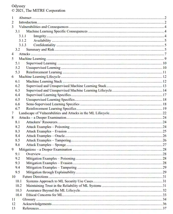 描述了软件系统通常面临的损害类型,并将它们与采用机器学习的系统所特有的公认后果类别联系起来。然后,我们解释导致这些后果的攻击向量。然后,我们在最广泛的类别中描述 ML 本身,包括从开始到部署和执行的生命周期。然后,我们确定生命周期中存在哪些漏洞,这些漏洞允许威胁对系统发起针对 ML 的攻击。然后,我们通过不同的示例对 ML 漏洞、攻击和缓解措施进行更深入的检查。