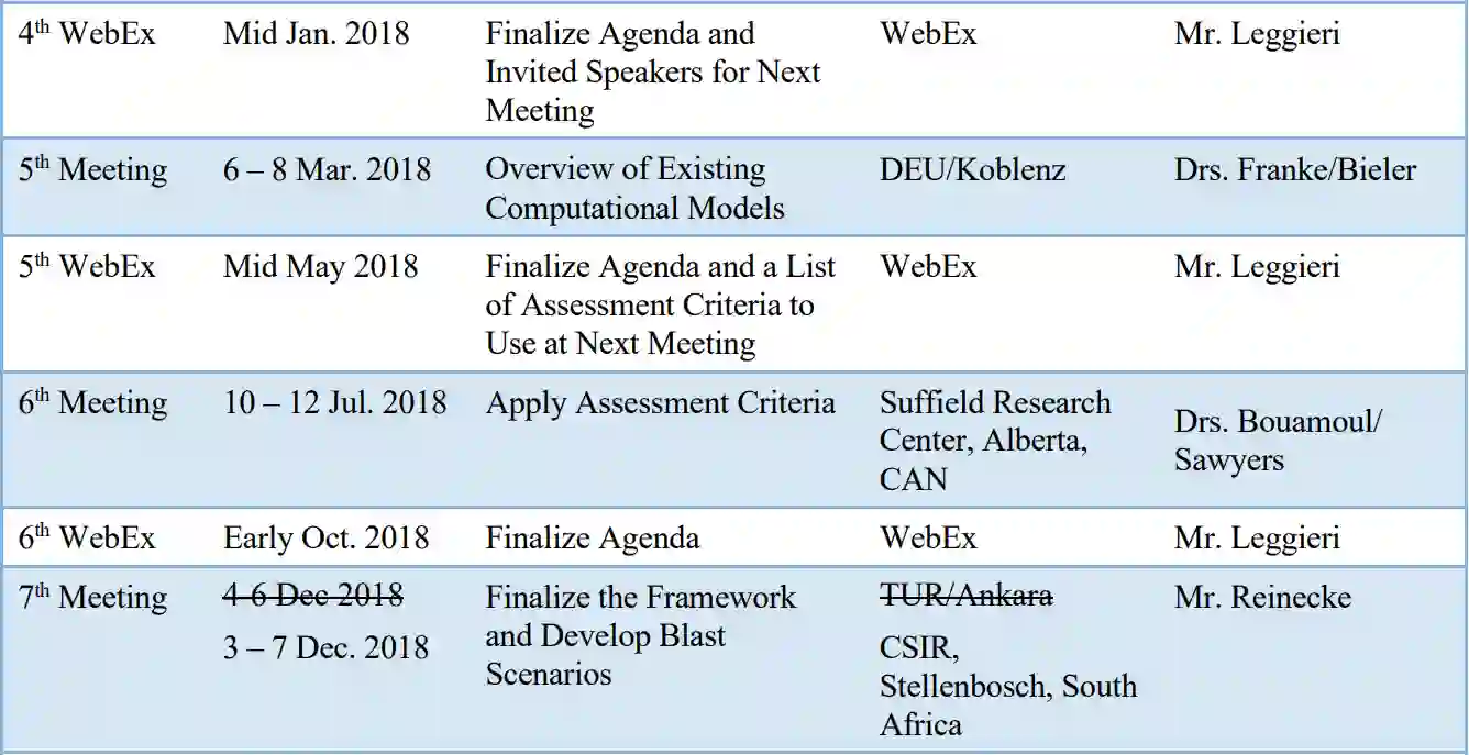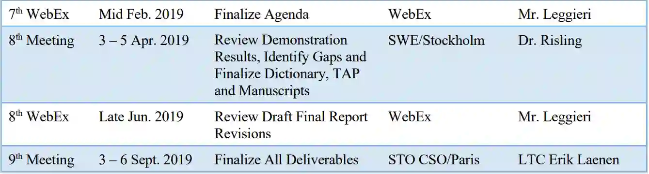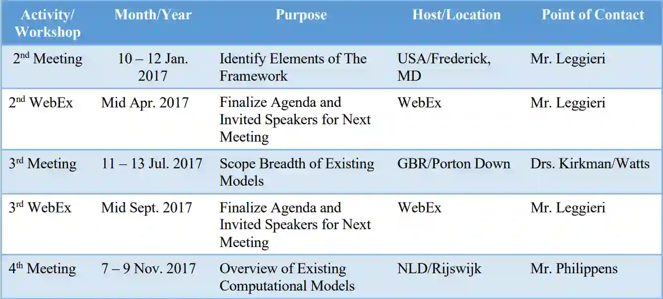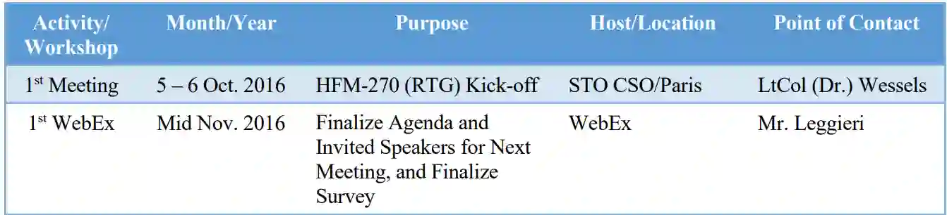 认识到这个RTG的雄心勃勃的目标,RTG成员认识到有必要每12个月举行三次面对面的会议,以促进完成PoW和发展可交付成果。一些成员自愿主办会议,但他们需要与各自的组织协调,以确认他们对主办会议的承诺。成员们同意,会议一般将持续三天。鉴于RTG的多学科组成,成员们一致认为每次会议都应该包括主题专家(SMEs)的发言,以使RTG成员对计算建模、生物医学研究和医学中与本团队整体工作相关的关键概念建立共识。RTG成员一致认为,中小企业将被邀请作报告,但不会了解RTG成员之间的后续讨论。RTG成员还同意,主办会议的国家将负责中小企业的旅行费用。如果主办国提出要求,北约科技组织CSO将提供资金支持中小企业的旅行;然而,没有任何成员国行使这一选择权。除了面对面的会议,成员们同意在每次面对面的会议中间通过WebEx或电话会议举行一次虚拟会议。不幸的是,时区差异和成员的可用性使这些虚拟的中间会议很难持续举行。成员们还同意最大限度地利用 "科学连接 "网站进行信息共享和文件开发。在启动会议上商定的会议时间表见表1-1。