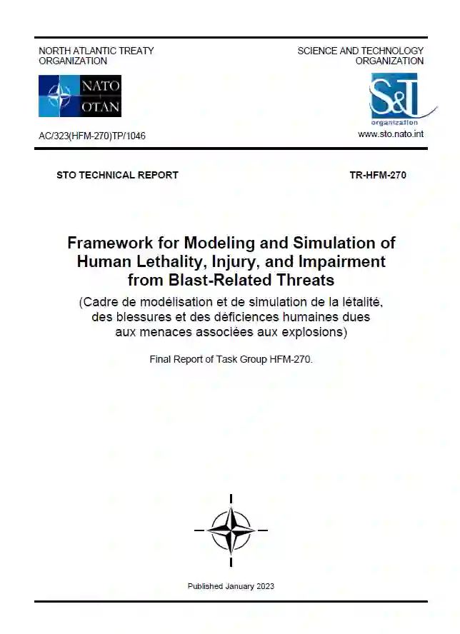 在过去的25年中,计算模型对爆炸威胁的预测和防护设备及系统的性能产生了重大影响。这些仿真结果表明,全面的、全人类的爆炸效应建模能力可以为北约国家提供应对快速出现的爆炸威胁的能力,并为训练和战斗场景创造更安全的环境。为了解决这些方面的建模与仿真问题,北约人因和医学小组成立了北约HFM-270研究任务组(RTG),"爆炸相关威胁造成的人类死亡、伤害和损害的建模与仿真框架"。HFM-270研究工作组由来自10个国家的22名指定成员组成。该小组代表了医疗、作战和物资开发界,以及不同的学科,包括工程、生物科学和医学。