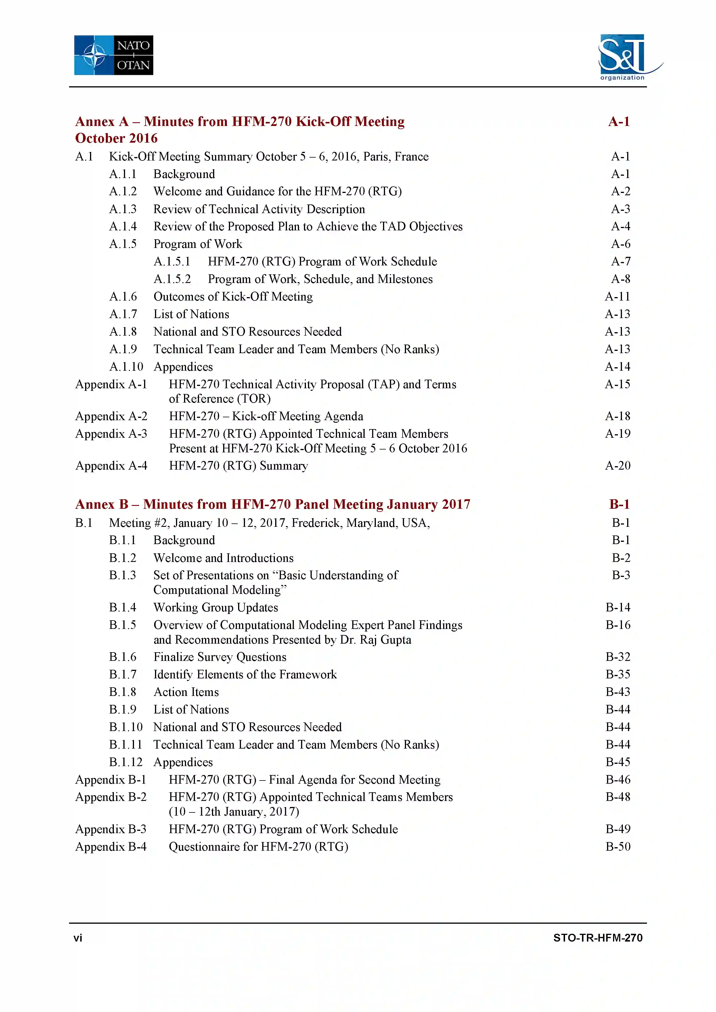 RTG成员成立了三个工作组(WG),专注于PoW中描述的具体交付成果。词典工作组的任务是在HFM-234 RTG开发的爆炸伤害研究术语综合词典的基础上,开发常用计算建模和模拟术语的综合词典;出版物工作组的任务是确定并指导RTG的工作在适当的同行评审期刊上发表;以及TAP工作组的任务是为HFM-270后续RTG起草一个TAP,为该框架制定标准化和验证标准及方法。