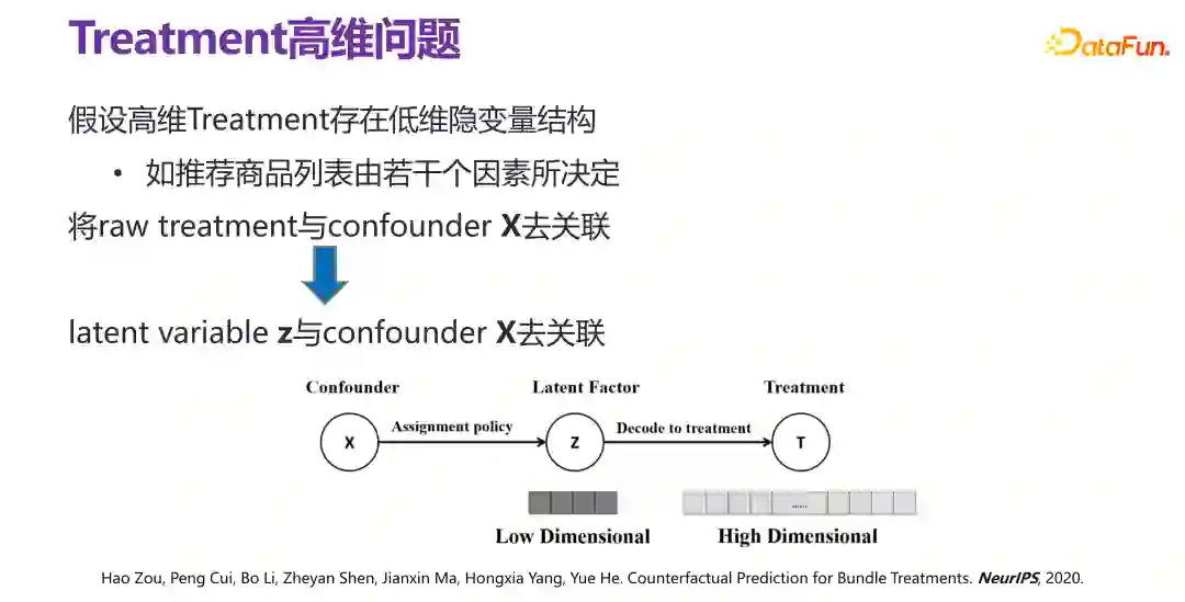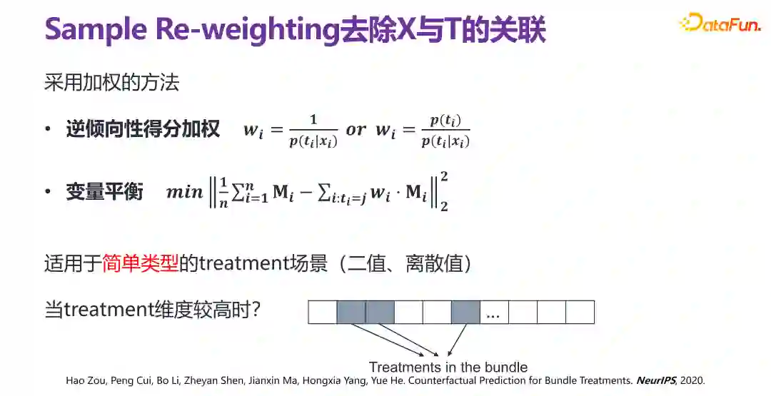 传统做法是采用样本重加权(Sample Re-weighting)的方法来去除 X 和 T 之间的关联,有两种方法:(1)逆倾向性得分加权,(2)变量平衡。但这些方法都存在局限性:只适用于简单类型的干预变量(treatment)场景,二值或离散值。在真实的应用场景下,比如推荐系统,干预变量(treatment)维度很高,给用户推荐商品,推荐的是一个束(bundle),即从很多商品中进行推荐。当干预变量(treatment)维度很高时,使用传统的方法,把初始干预变量(raw treatment)和混淆变量(confounder) X 直接去关联,复杂度非常高,甚至样本空间不足够来去支撑高维度的干预变量(treatment)。