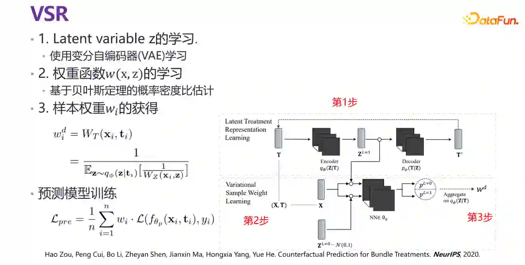 如果假设高维度的干预变量(treatment)存在低维隐变量结构,也就是给出高维度的干预变量(treatment)原则上不是随机出来的,比如推荐系统中,给定推荐策略推荐出来的商品束(bundle),里面的商品和商品之间都有各种各样的关系,存在低维隐变量结构,也就是推荐商品列表由若干因素所决定。 如果高维度的干预变量(treatment)下有一个隐变量(latent variable) z,实际上可以把问题转化为 x 与 z 之间的去关联,即和隐性因素(latent factor)之间去相关。通过这种方式,可以在有限的样本空间下实现束处理(bundle treatment)。 因此提出了新方法 VSR。VSR 方法中,首先是高维度干预变量(treatment)的隐变量 z(latent variable z)的学习,即使用变分自编码器(VAE)进行学习;然后是权重函数 w(x,z)的学习,通过样本重加权的方式对 x 和 z 之间进行去相关(decorrelation);最后在重加权的相关分布下直接使用回归分析模型(regression model),就能得到一个比较理想的策略个体效果预测模型。