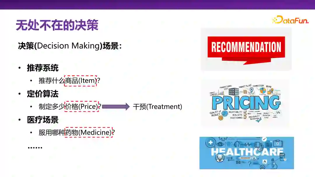 决策场景无处不在。众所周知的推荐系统,给一个用户推荐什么样的商品,实际上是在所有商品里做了一个选择决策(selection decision)。在电子商务中的定价算法,比如物流服务定价等,如何为一个服务制定一个合理的价格;在医疗场景中,针对病人的症状,应该推荐使用哪种药物或者治疗方式,这些都是干预性的决策场景。