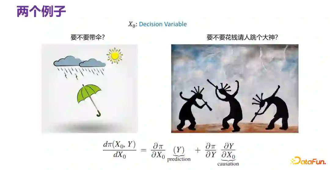 如上图所示的两种决策场景,其中 x0 是决策变量(decision variable),在两个场景下的定义是分别不同的。 先看左边的场景案例。要不要带伞,和是否下雨之间是没有关系的,即 x0 和 Y 不相关,带入到图片中,即图片为 0,则图片。那么预测出来是否要下雨,最终的收益是不一样的。所以这个例子很明显是一个预测性决策(prediction decision)。 右边的案例是如果你是一个酋长,要不要花钱请人跳大神求雨,实际上很大程度上取决于“跳大神”到底能不能求到雨,是否有因果效应。等式右侧的图片,如果能预测出来是否下雨,那么图片为 0,即收益(是否下雨)和决策变量(跳不跳大神)其实是没有任何关系的。那么这就不是一个预测性决策,是一个纯粹的因果性决策。 通过上述两个实际的决策案例场景,可以将决策问题划分为两类:预测性决策和因果性决策,并且 Jon Kleinberg 给出的决策问题的框架,也很好地说明了对决策的划分。
