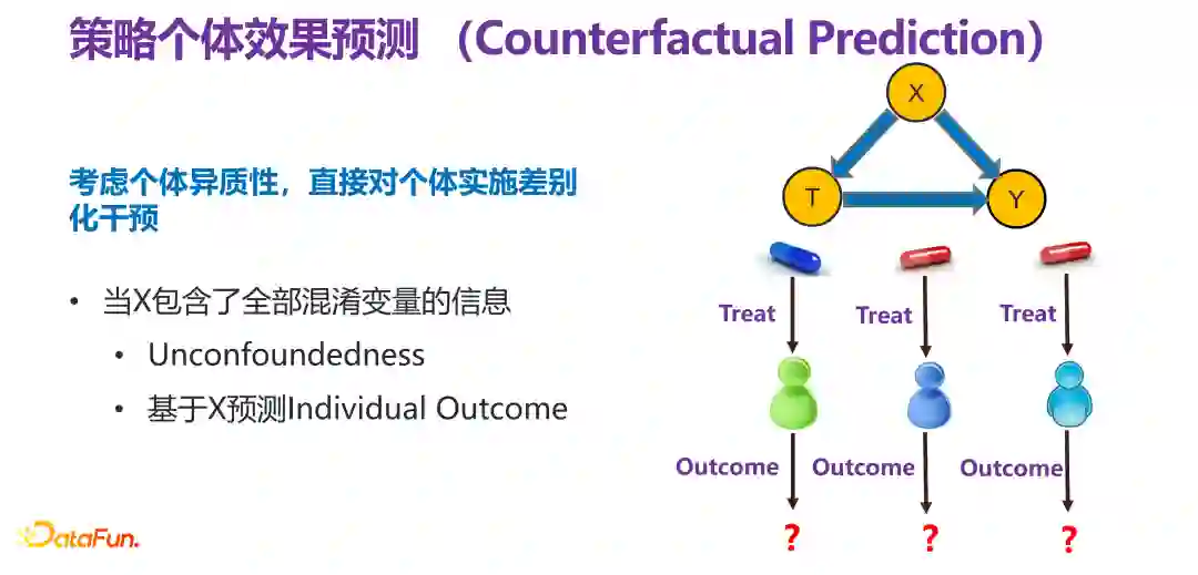 (2)现有方法的局限 策略个体效果预测常用的方法是直接对个体进行预测建模,也就是基于历史观测数据图片,然后训练得到反事实预测模型图片,即给定了 X 和 T,能比较合理和准确地预测实际效果 y 是怎样的。