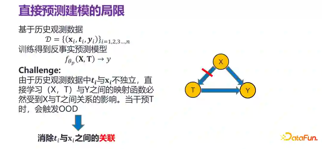 如果直接在历史数据分布下,做回归分析或者类似的模型,是有问题的。因为历史观测数据中的 ti 和 xi 并不独立,直接学习(X,T)与 Y 直接的映射函数必然受到 X 与 T 之间的关系影响,也就相当于给定了一个 xi,在历史数据里面必然对应一个 ti,比如 ti 就应该等于 0,当干预 T 时,比如硬要把 ti 改成 1,实际上就已经不服从原来的历史分布了,意味着在历史数据分布下构造出来的 ID(In-Distribution)预测模型就无效了,触发了 OOD(Out-of-Distribution)。