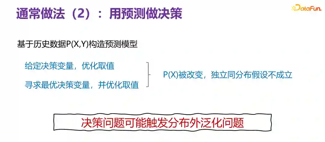 继续深入思考一下预测准确性问题。假设基于历史数据 P(X,Y) 构造了一个预测模型,然后去探索一些不同的关键行为所带来收益,即如前面所述的多次射箭,看到底哪一次靶数最大。拆解一下,可以分为两类不同的情况。 第一类是给定决策变量,优化取值。事先知道了输入变量 X 中哪一个是比较好的决策变量,比如价格是 X 里面的一个决策变量,则变化价格变量的取值,用已构造出来的 P(X,Y) 预测模型去预测改变取值后的情况如何。 另外一类是寻求最优决策变量,并优化取值。事先并不知道 X 中哪一个是比较好的决策变量,场景上相对比较灵活,需要寻求最优的决策变量并优化其取值,也就是变化最优的决策变量的取值,然后看哪个取值经过预测模型预测的结果好。 基于这样的前提假设,在改变决策变量的取值时,实际上是改变了 P(X),即 P(X) 发生了变化,P(X,Y) 肯定会发生变化,那么独立同分布的假设本身就不成立了,意味着预测实际上很有可能失效。因此决策问题,如果用预测的方式来做,就会触发分布外泛化的问题,因为改变了决策变量的取值,一定会发生分布偏移(distribution shift)。在分布偏移的情况下,怎么样做预测,是属于分布外泛化的预测问题范畴,不是今天文章的主题。如果在预测领域能够解决分布外泛化的预测问题,用预测做决策也是可行的路径之一。但当下用 ID(In-Distribution)或者直接预测(direct prediction)的方法做决策,从理论上来讲是失效的,是有问题的。