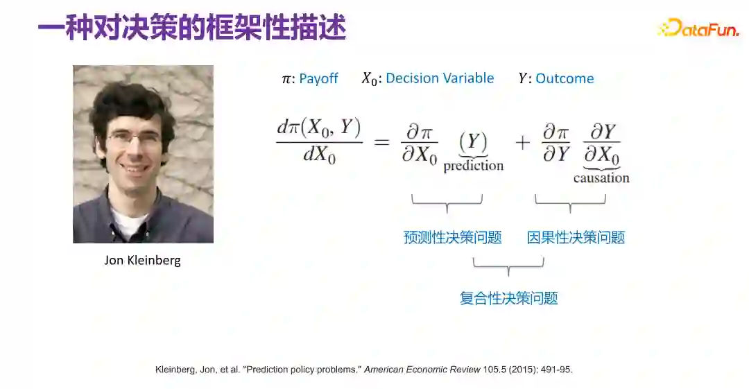Π 是收益函数(Payoff function),x0 是决策变量(Decision Variable),Y 是因决策变量产生的结果(Outcome),Π 实际上是 x0 和 Y 的函数。那 x0 怎样变化,Π 是最大的,就可以去求这样的一个导数 图片,然后将它展开为图片。展开后,根据 Y 和 x0 是否不相关,等式右边分别刻画了两种决策(decision)场景。第一种决策场景,就是 Y 和 x0 不相干时,即图片,但 图片和 Y 是有关系的,这种情况下,如果能够很好地预测 Y,就能用已预测的 Y,更有针对性地用 图片 来做决策,这就是预测性决策问题。另外一种决策场景为,x0 做了这样的一个决策,会影响 Y,Y 又会影响收益,这就是一个因果性决策问题。那什么情况下决策场景是因果性的,什么情况下是预测性的呢,后续会有案例解释;当然也有复合性决策场景,既有因果性的,又有预测性的。到此,就初步地框架性地描述了决策问题是怎样的。