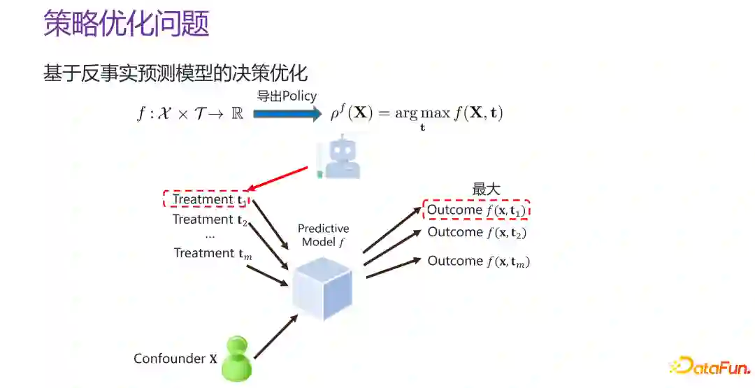 策略优化和前面两种的预测评估是有本质性区别的。预测评估都是提前给定一个策略(policy)或者个性化的干预(individual treatment),去预估最终的结果。策略优化,也叫策略学习,目标只有一个结果变大。比如收益要增长,应该施加什么样的干预。
